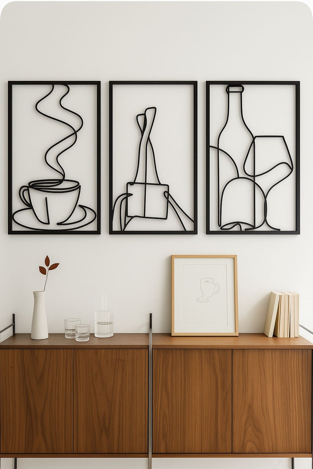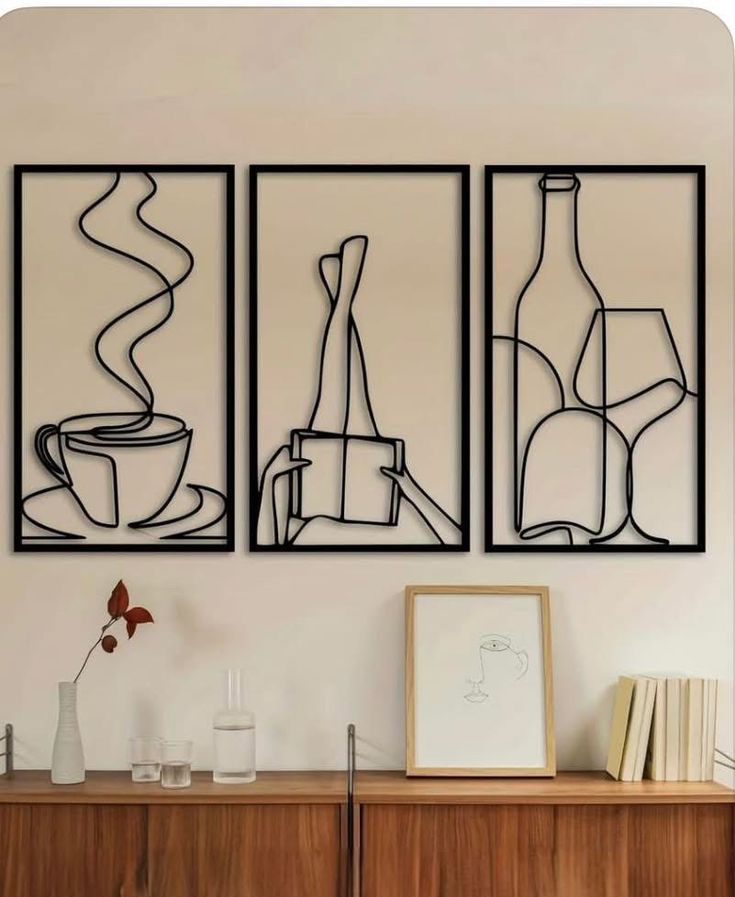 Three-panel matte black wall art set — tea, reading, and wine scenes. Minimalist metal decor for cozy spaces and modern homes.