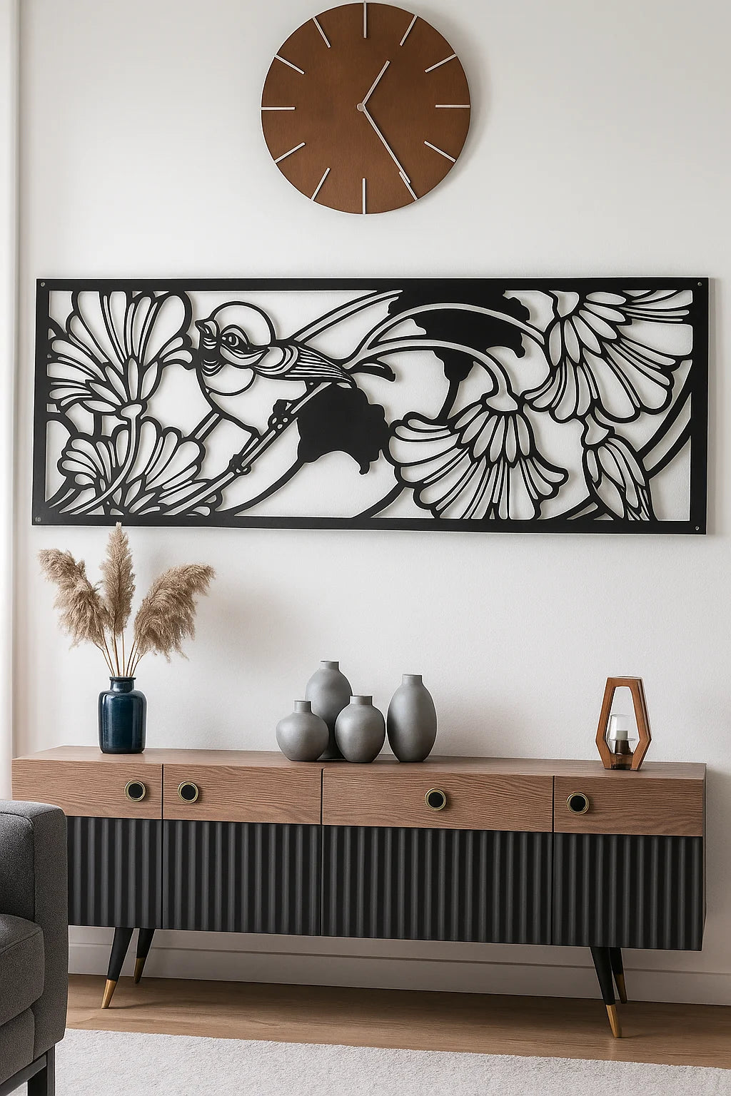 Laser-cut from premium-grade metal and finished in a smooth matte black powder coating (lasting 5–15 years), every petal, feather, and curve is rendered with fine precision. The elongated rectangular frame enhances its impact, creating a balance of detail and minimalism.